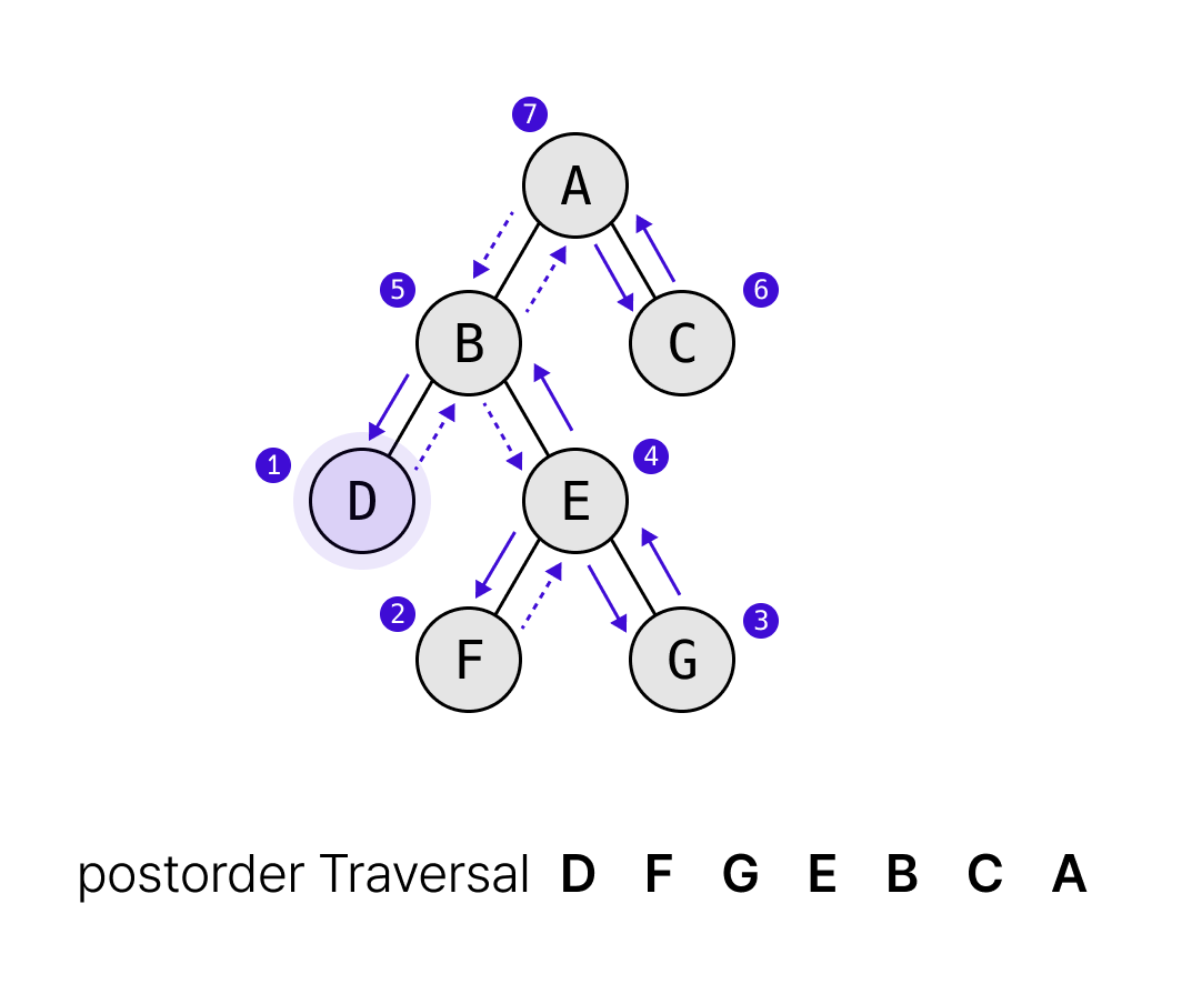 후위 순회는 루트를 가장 마지막에 순회한다. 제일 왼쪽 끝에 있는 노드부터 순회를 시작해 루트를 거치지 않고 오른쪽으로 이동해 순회한 뒤, 제일 마지막에 루트를 방문한다. 후위 순회는 트리를 삭제할 때 사용한다. 자식 노드가 먼저 삭제 되어야 상위 노드를 삭제할 수 있기 때문이다.