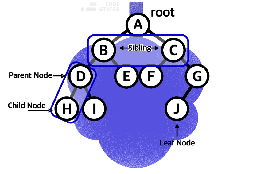 트리 구조는 Root(루트)라는 하나의 꼭짓점 데이터를 시작으로 여러 개의 데이터를 Edge(간선)으로 연결한다. 각 데이터를 Node(노드)라 하며, 두 노드가 상하 계층으로 연결되면 부모/자식 관계를 가지는 부모 노드(Parent Node), 자식 노드(Child Node)가 된다. 자식이 없는 노드는 나무의 잎과 같다 하여 리프 노드(Leaf Node)라 부른다.