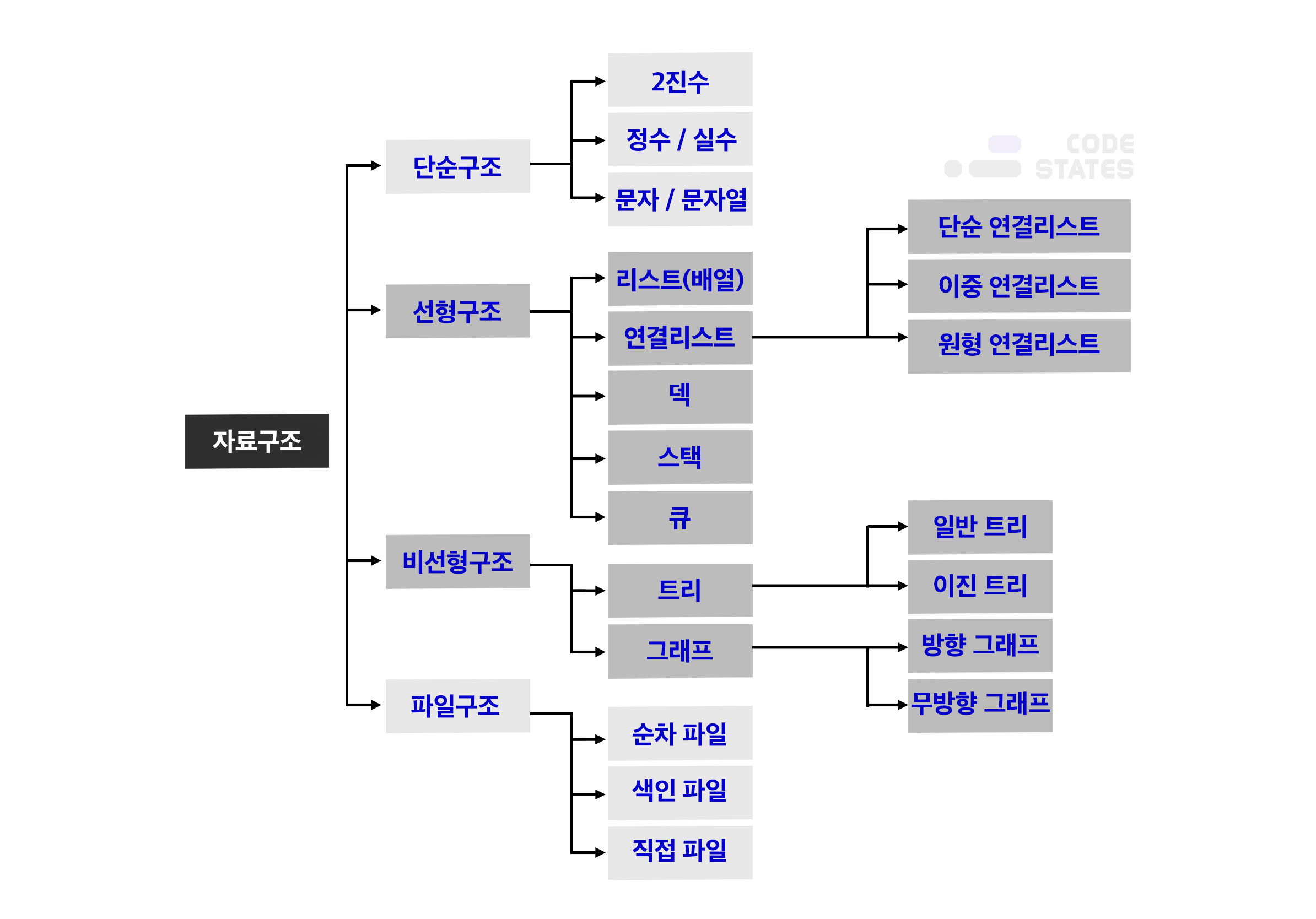 자료구조란 여러 데이터의 묶음을 저장하고 사용하는 방법을 정의한 것이다. 단순한 타입(형태)을 넘어, 데이터의 종류와 쓰임새는 정말 다양하다. 우리가 활용해야 하는 데이터는 무궁무진 하기 때문에 데이터를 정해진 규칙 없이 저장하거나 하나의 구조로만 정리하고 활용하기 보다는 데이터를 체계적으로 정리하여 저장하는 것이 데이터 활용에 유리하다. 자료구조는 데이터를 효율적으로 다룰 수 있는 방법을 모아둔 것이고, 그 방법은 필요에 따라 여러 분류로 나뉜다.