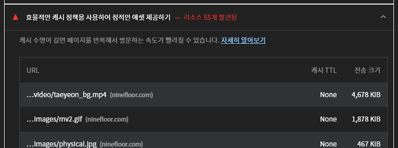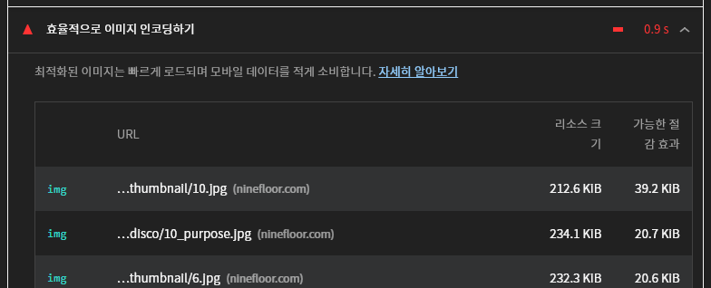 Lighthouse는 성능을 측정할 뿐 아니라 무엇이 시간을 많이 소모하는지, 어떻게 개선하여 최적화를 할 수 있을지 해결책도 제시한다. 각 항목을 열면 해당 문제에 대한 상세 설명과 함께 어떤 코드나 화면에서 문제 상황을 발견했는지 확인할 수 있어 최적화의 방향을 잡기 좋다.