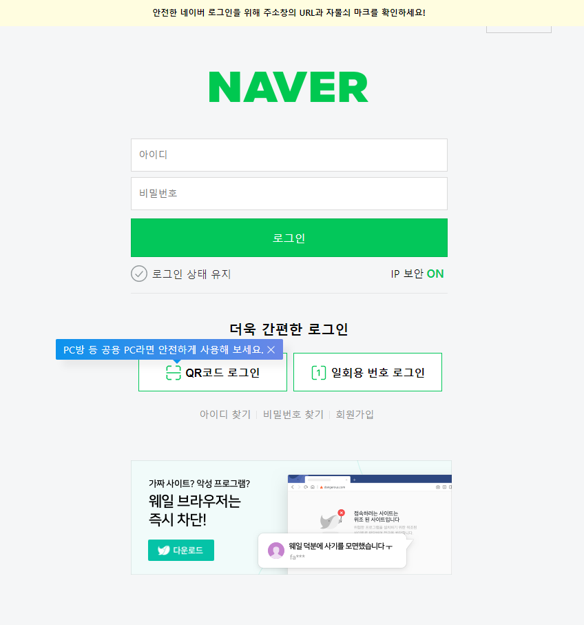 <span>안전한 네이버 로그인을 위해 주소창의 URL과 자물쇠 마크를 확인하세요!</span>